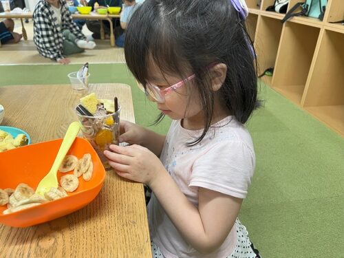 お菓子やフルーツ、クリームなどを使い思い思いのパフェを作りあげています❗