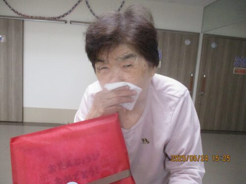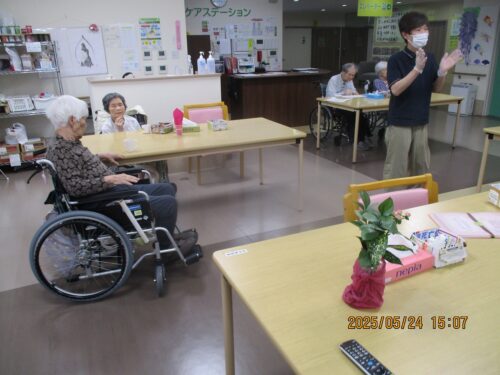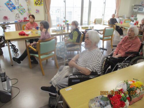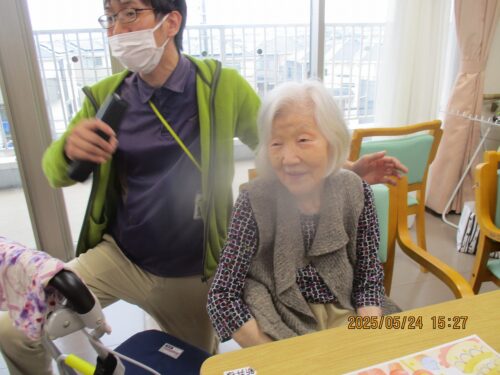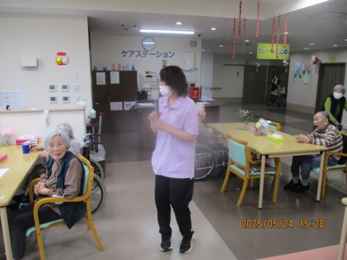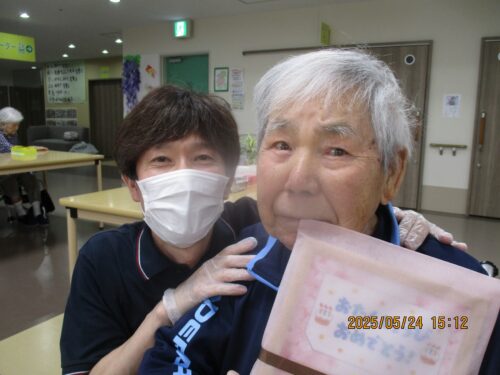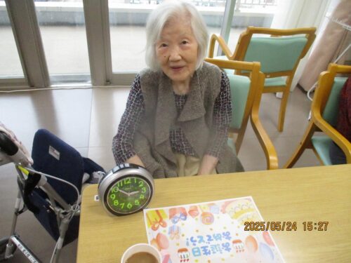 職員から長生きの秘訣をお誕生日の方にお伺いすると『皆様と一緒におれたので長生き出来ました。』と話され周りのご入居者様から拍手が送られました。