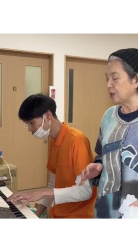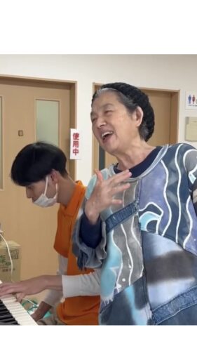 音の鳴る方へ行ってみると、一人の入居者様がスタッフが奏でるピアノに合わせて、