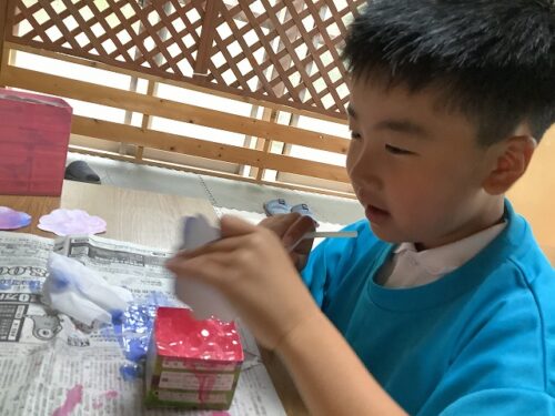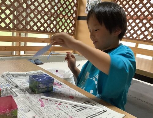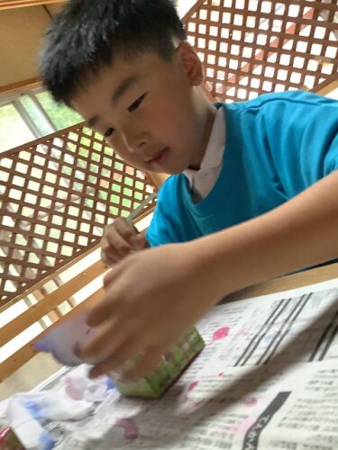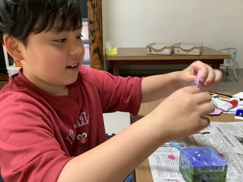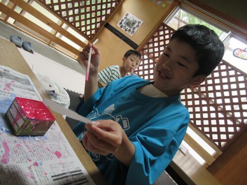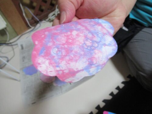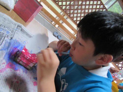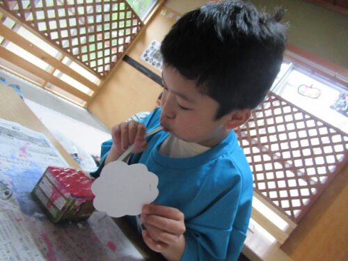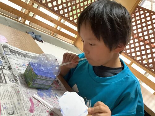 絵の具で色を付けた色水にストローで息を吹き込みます。