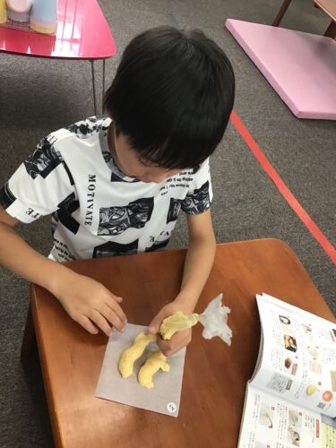 今日のおやつは豆腐チュロスです。生地をこねて。