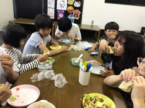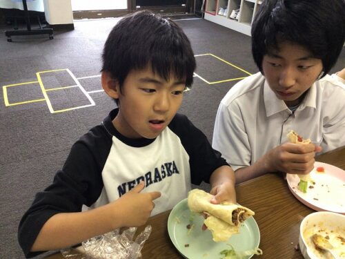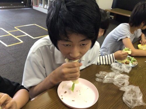 職員お手製のトルティーヤに、職員お手製絶品のひき肉、レタス、トマト、チーズを挟みます😋