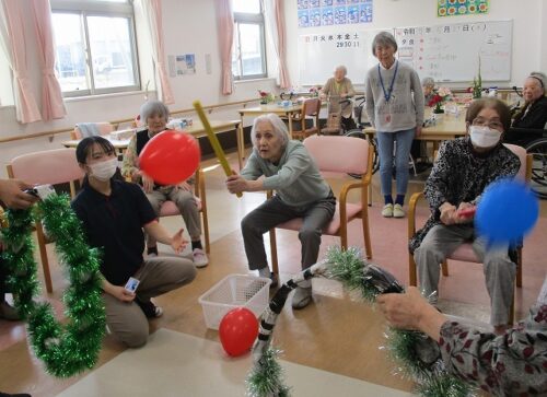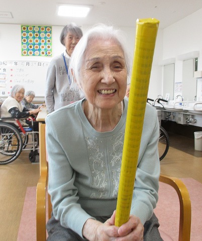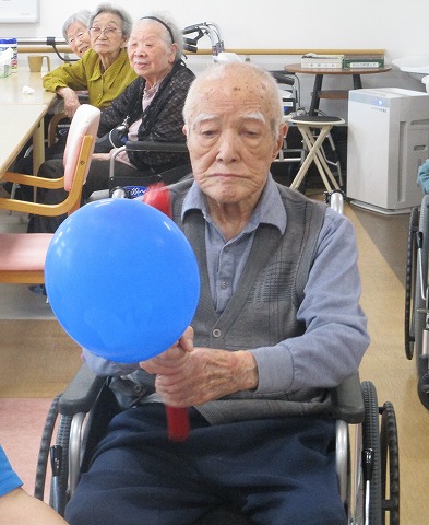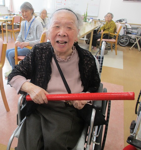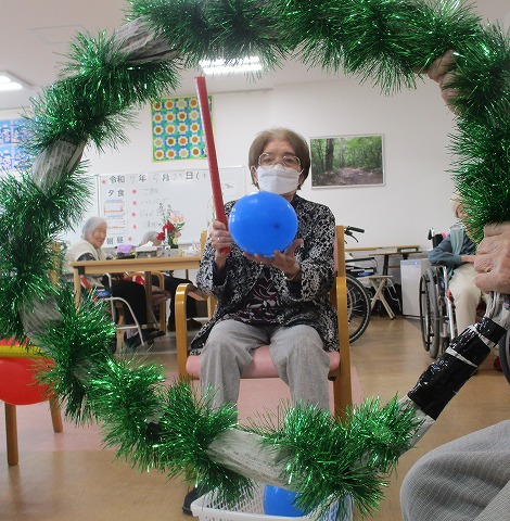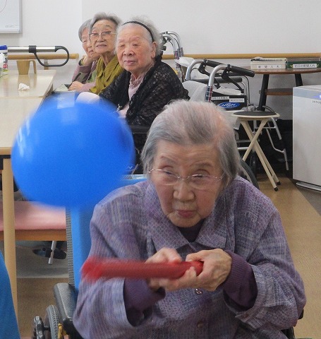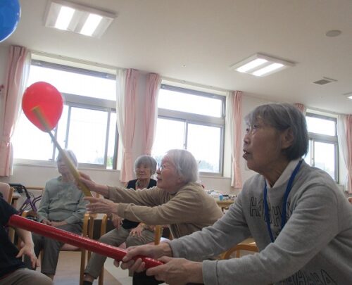 今回のスポーツレクは、風船を棒でつついて、大きな輪の中を通すゲームです!