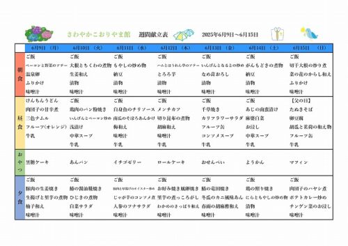 さわやかこおりやま館 今週の献立表🍚☆さわやかこおりやま館 2025-06-09 2025-06-07 こんにちは、さわやかこおりやま館です(^▽^)/ 今週の献立(6/9~6/15)こちらになります🍚 担当:千葉