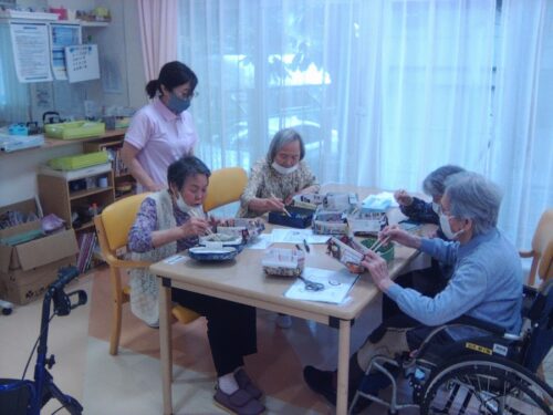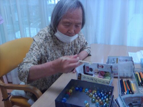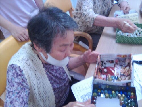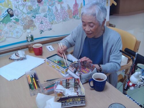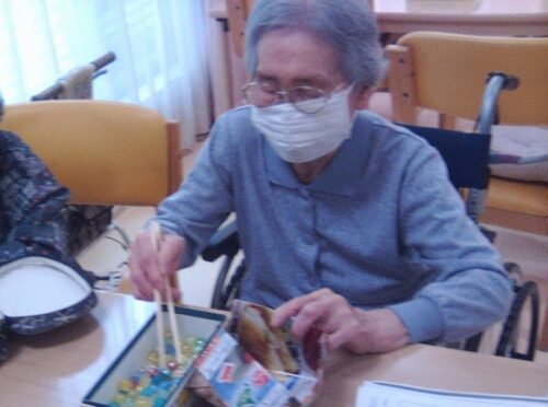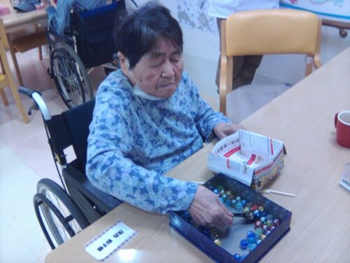 本日のショートステイのレクは割りばしで、ビー玉をつかむゲームです!
