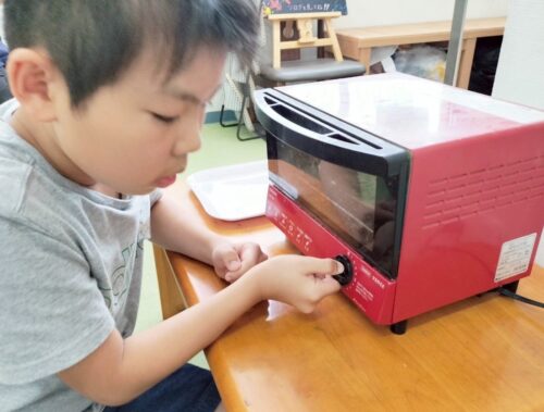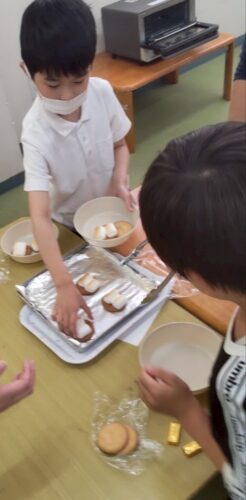 ビスケットの上にマシュマロをのせたら、トースターで焼きます。