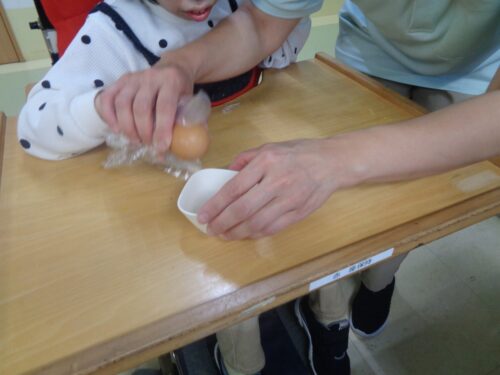 卵を割り,牛乳を入れます。