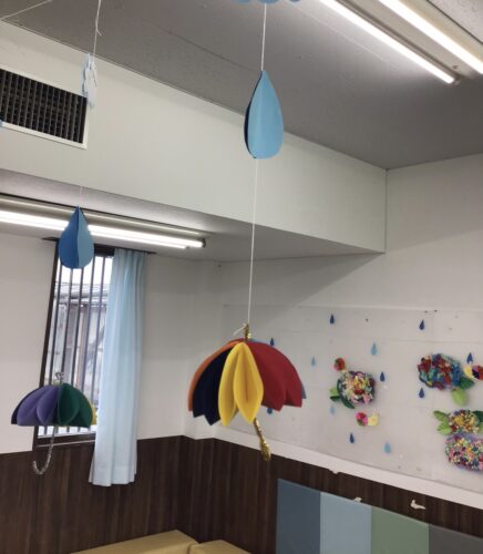 完成した傘は、さっそく室内に飾りつけ✨天井から吊り下げると、お部屋がパッと明るく可愛いらしくなりました🌈😊