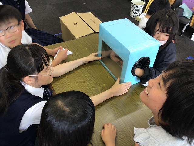 職員お手製の箱の中に両手を入れて、手の感覚だけで何が入っているか当てていきます✨