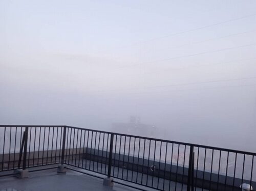 今朝は霧で視界開けず・・