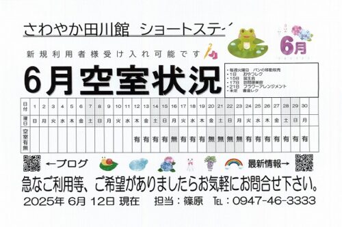 さわやか田川館のショートステイ、空室状況をお知らせします。