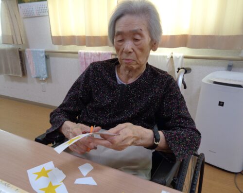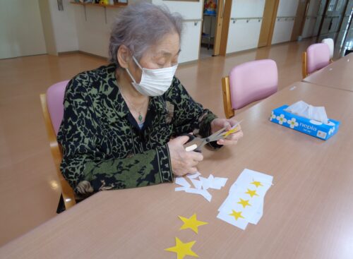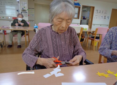 さわやかみなと館 キラキラ輝く天の川✨【さわやかみなと館】 2025-06-12 2025-06-12 こんにちは🌟 さわやかみなと館です🌈 7月の七夕に向けて天の川作りに励んでくださる皆様💕 この日は貼り付ける星を丁寧に切ってくださいました♪♪ 皆様集中して一枚一枚丁寧に🌈✨ どんな天の川になるのか楽しみです💚💜💙💛 担当 小泉💫
