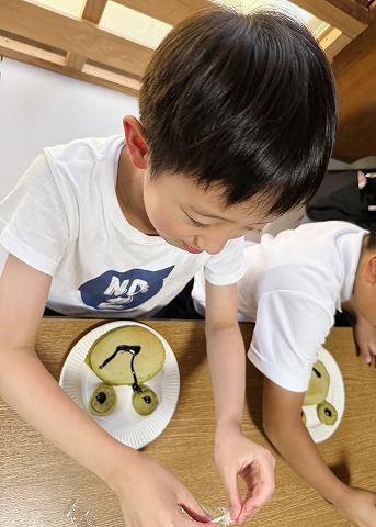 一人一人、チョコソースで自分で顔を描いてみました🍫