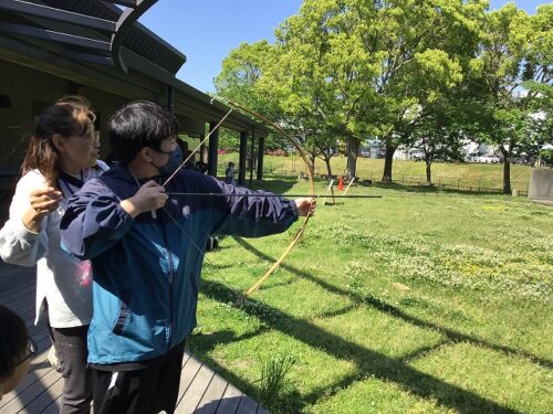 まが玉作りが終わった子どもたちは、弓矢体験をさせてもらいました😊✨
