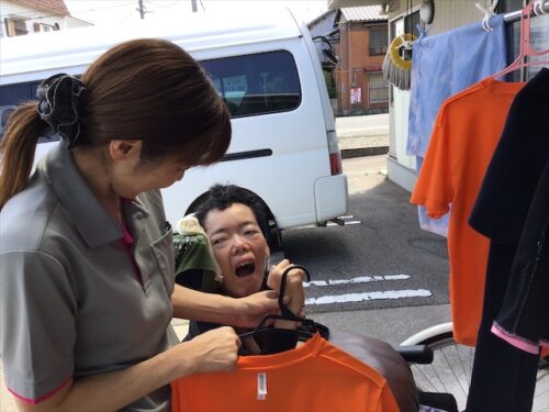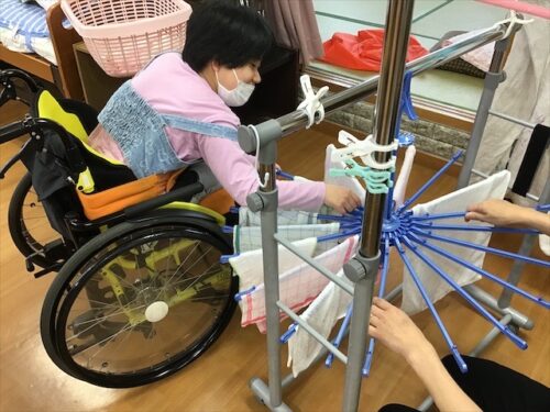 こちらの利用者様は、職員と一緒に洗濯を干しに👕