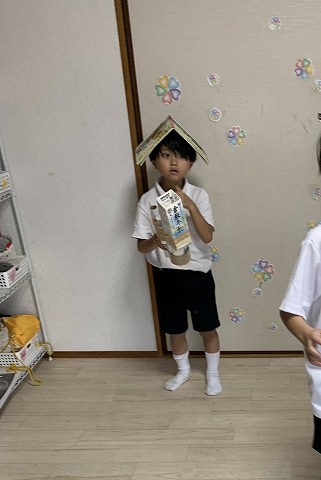 本を広げてみるという作戦が出てきて、本を広げ頭に載せ 上手に歩くことができました。