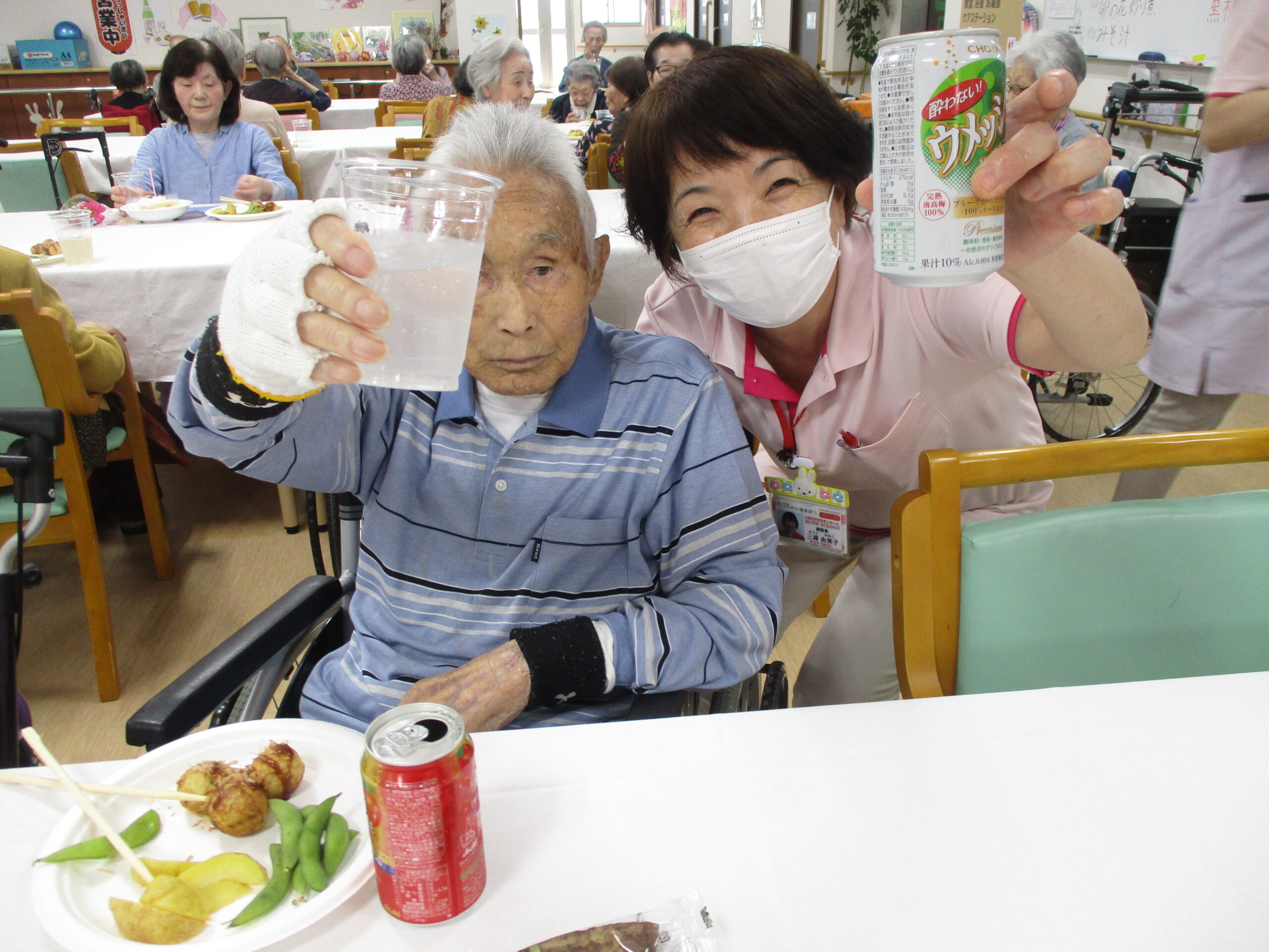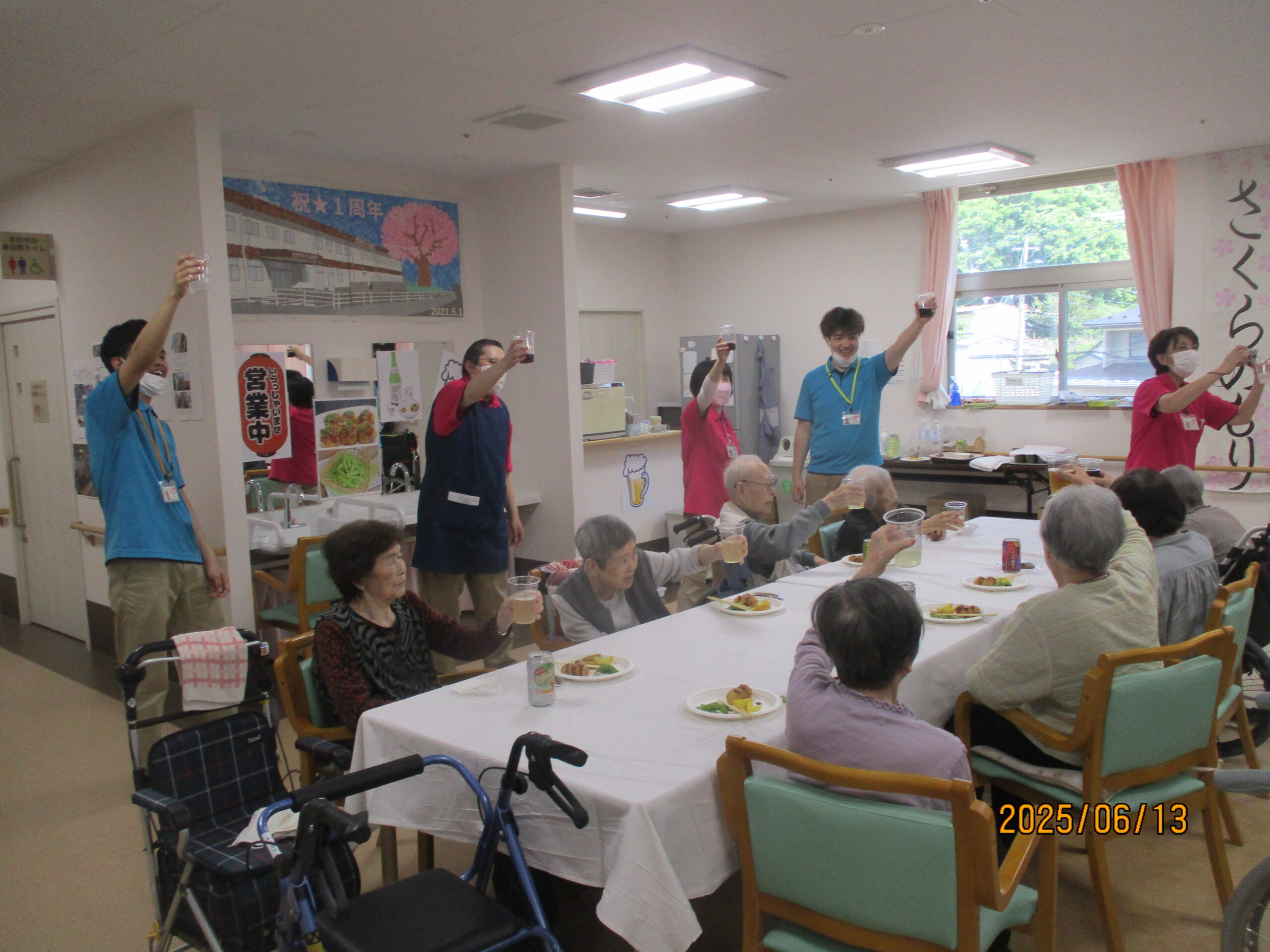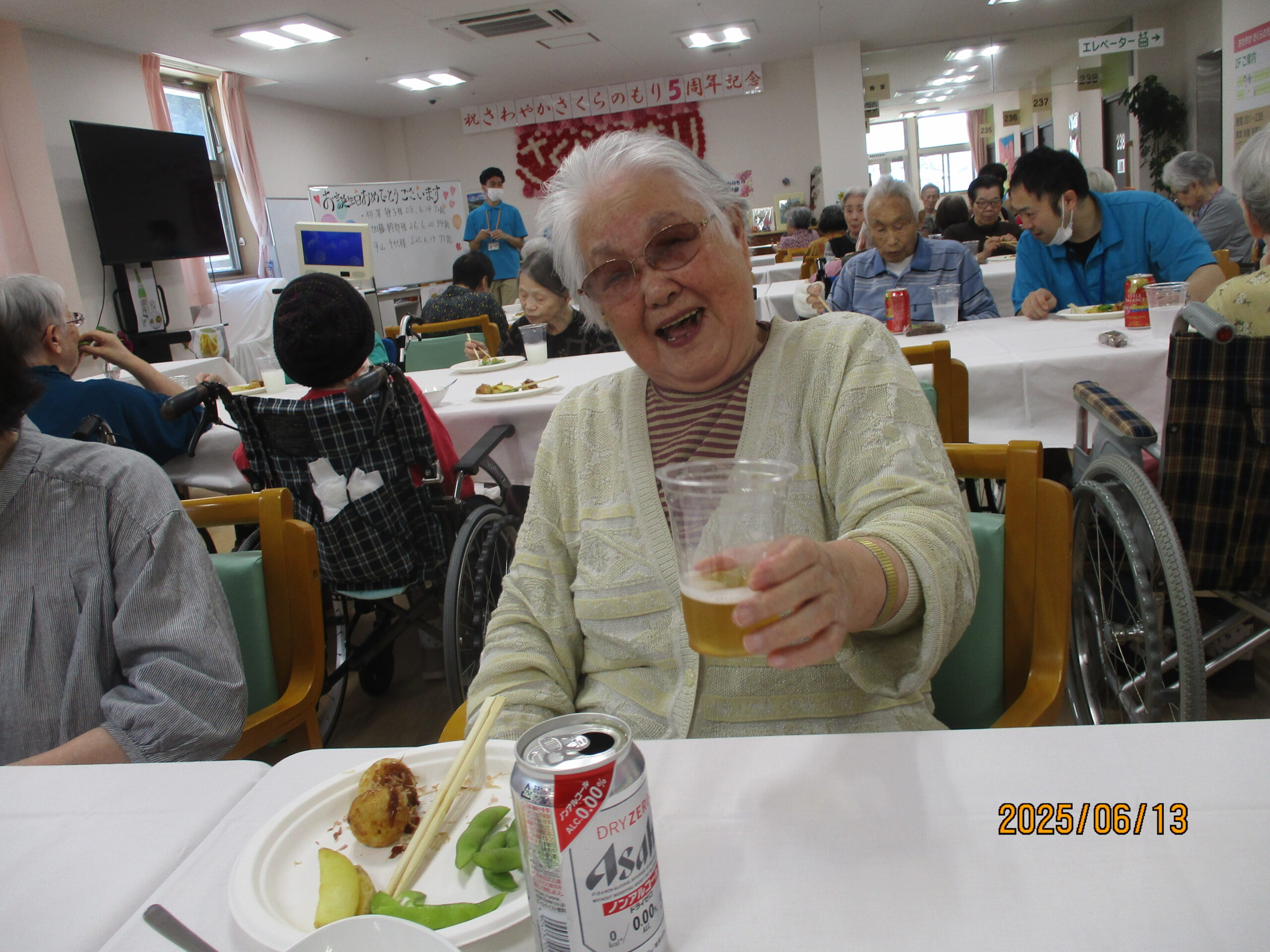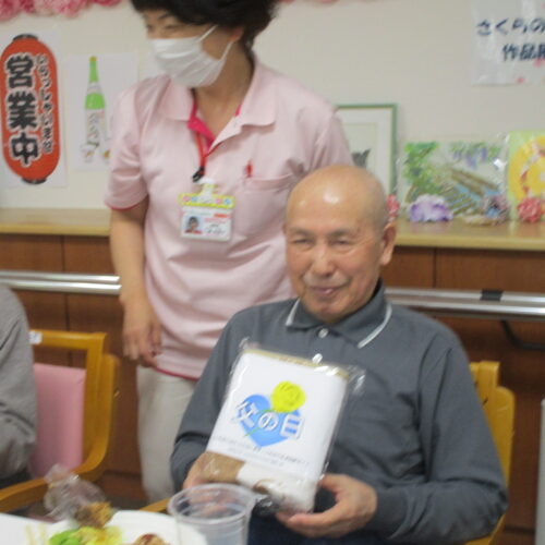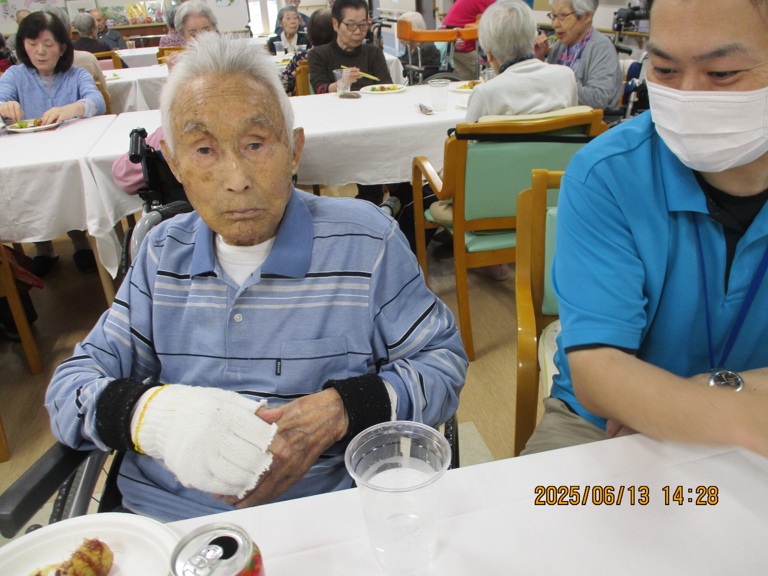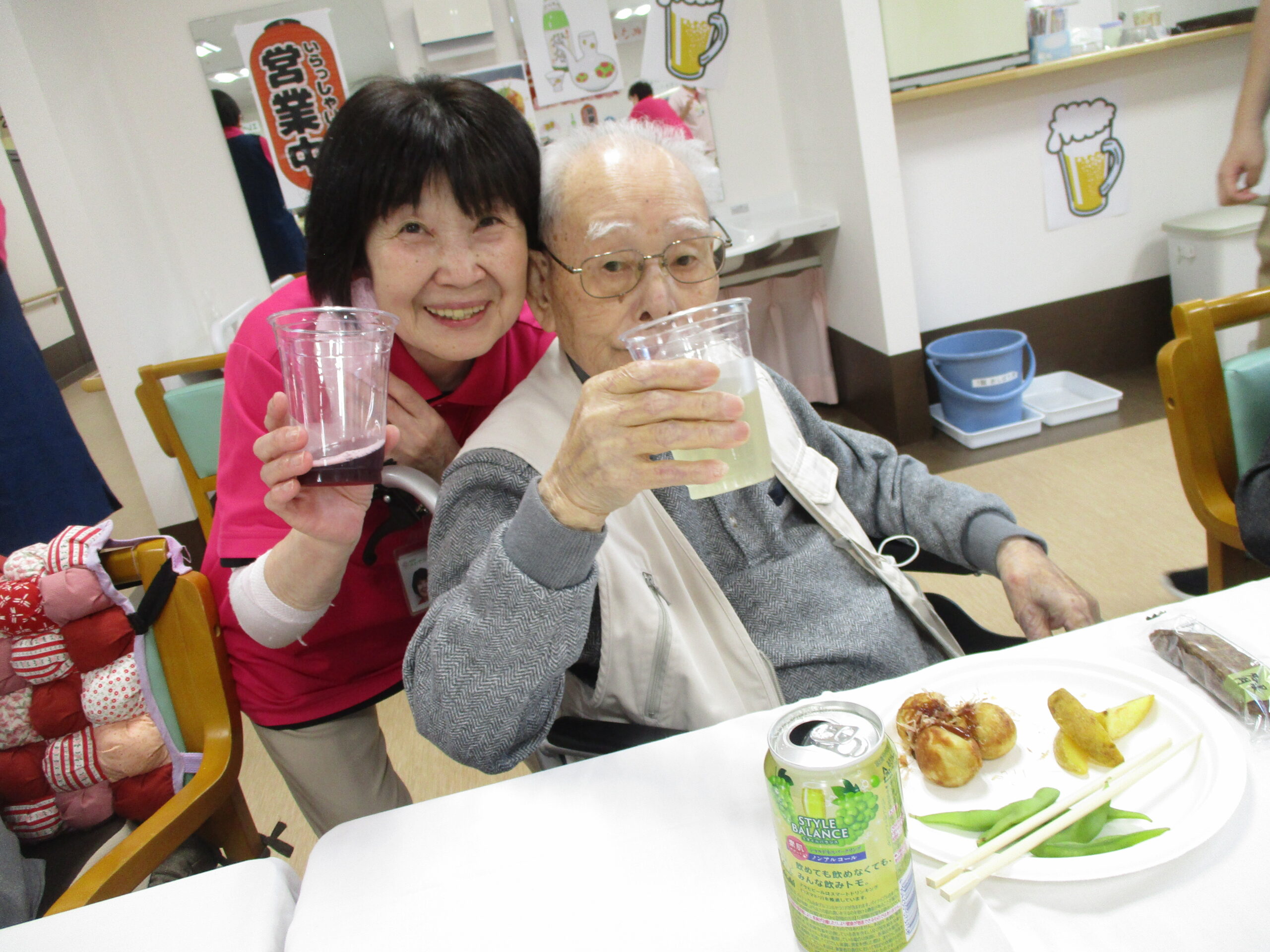 皆さん。こんにちは。今日のブログは昨日行われた誕生会レクの続きの様子です。誕生日会終わった後、父の日にちなんで居酒屋レクが行われました。