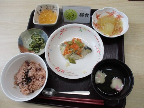 赤飯・鰺の南蛮漬け・冬瓜のカニカマあんかけ🦀