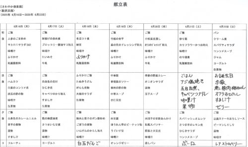 さわやか新居浜館 今週の献立 2025-06-16 2025-06-16 こんにちは さわやか新居浜館です 今週の献立をお伝えいたします 22日は今月のお誕生日食です。 楽しみにしていてくださいね。 担当 : 大平り