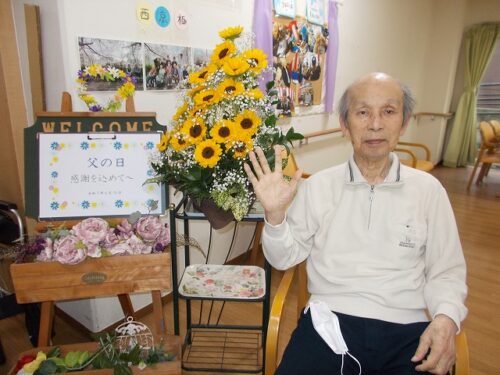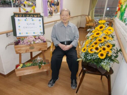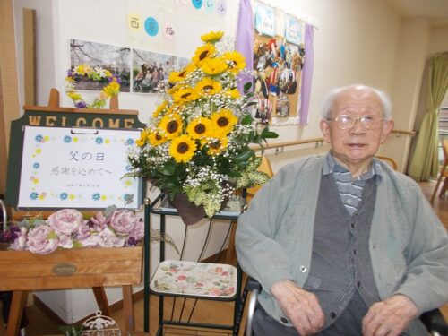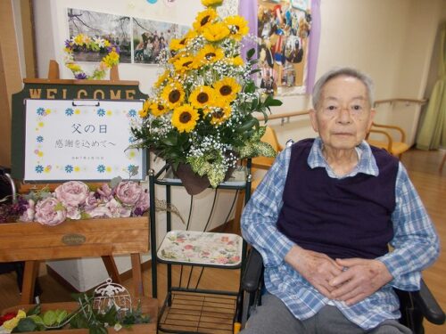 15日の父日には、男性入居者様全員に日頃の感謝の気持ちを込め、ヒマワリのお花を贈らせて頂き、皆様で楽しくお祝いさせて頂きました。