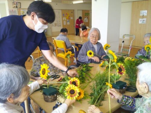 入居者様も思い思いに、ひまわりを手に取り茎の長さを変えたりして