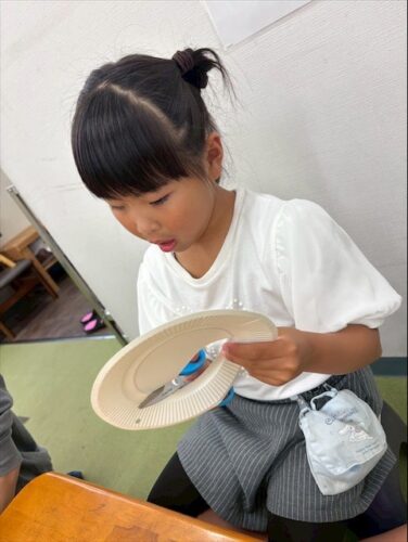 紙皿に葉っぱ🌱と花びらをたくさん貼ります♪