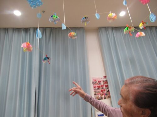 さわやかグループホーム なすしおばら すいせんユニットの様子 2025-06-18 2025-06-18 少し前から作って頂いていた飾りが完成しました☂☂☂ 天井飾りになりました ☀☀☀体雨の日でもこの飾りのおかげで気分は快晴です☀☀☀