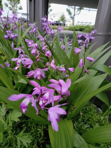 玄関前の紫蘭が細長い星型の花を咲かせています🎵