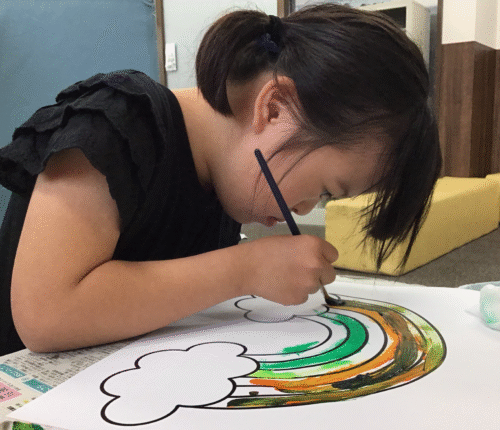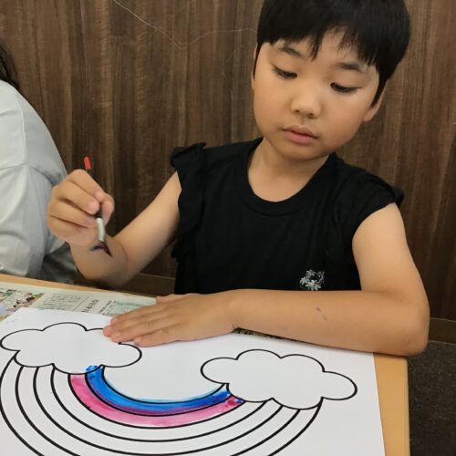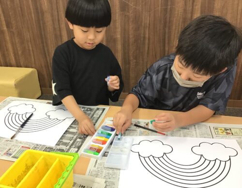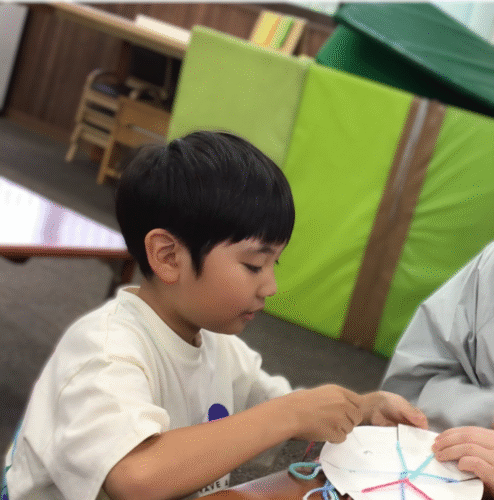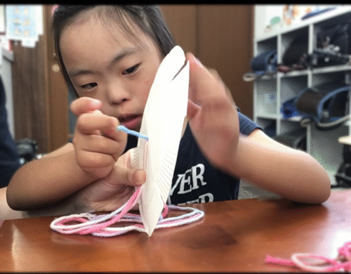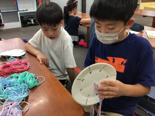 紙皿に数字や色シールを貼り順番に毛糸をかけて作っていきました