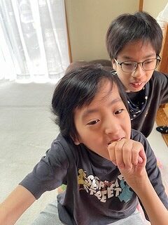 ピーナッツ型のバランスボールに乗っているお友達をみて