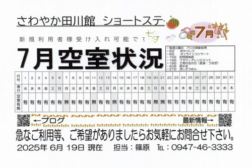 ショートステイの空室状況 6月/7月 [さわやか田川館]
