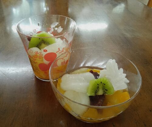 さわやかいずみ館 料理レクレーション② さわやかいずみ館 2025-06-26 2025-06-23 こんにちは😄 昨日に引き続き 料理レクレーションです😊 完成したものが こちらです🍨 中身は🤩 白玉🤍 パイナップル🍍 黄桃🍑 キウイ🥝 あずき🫘 ホイップクリーム🤍 美味しそうに 出来上がりました😆