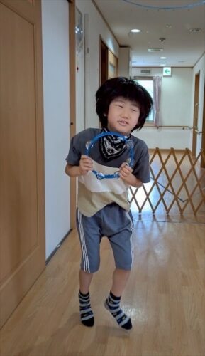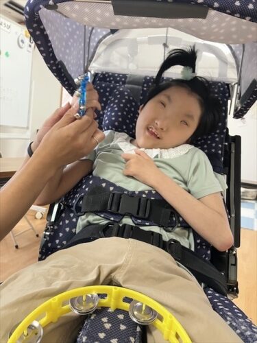鈴の音が気に入り力強く自分の力で楽器を持つことが出来ました。