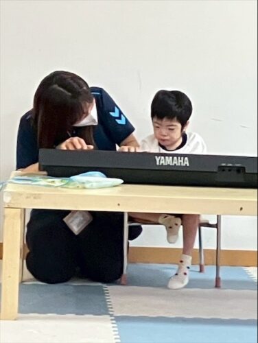 キーボードで職員と一緒に鍵盤を押して音を出して楽しんでいます。