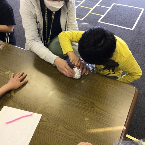 袋の中に入れ、好きな色のモールでてるてるぼうずの首のところを止めました