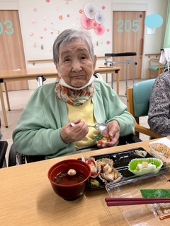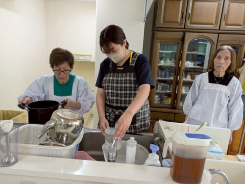 入居様も割烹着を身に着け、お吸い物作りやきざみ食の方ように食べやすく切ってくださったり積極的にお手伝いをしてくださいました