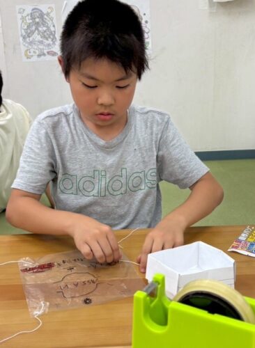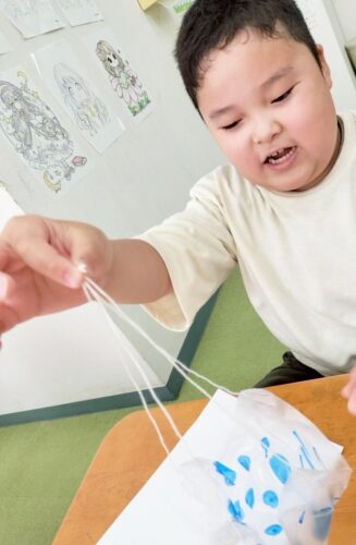 四本の糸を一つにまとめて、紙を丸めた玉をとりつけたら完成❗️