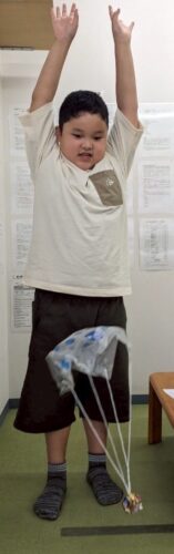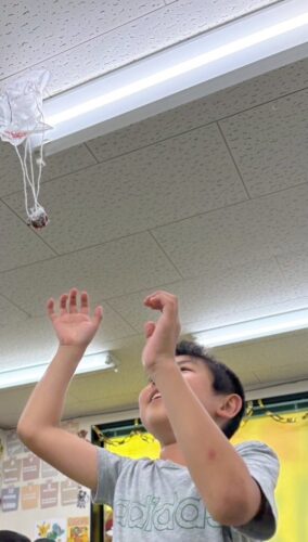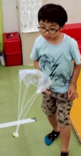 みんながパラシュートを飛ばすと、きれいにパッと開いてフワフワと落下しました。