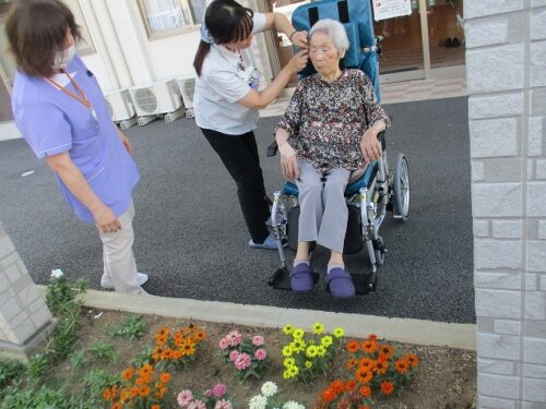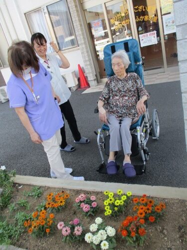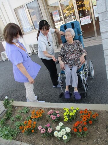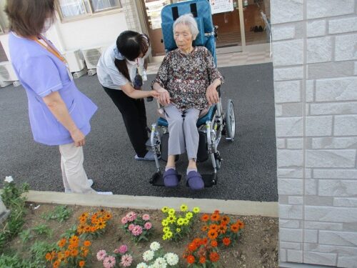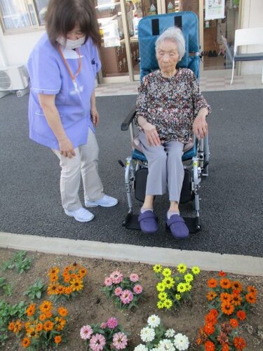 ご入居者様をお誘いして、花壇のお花を