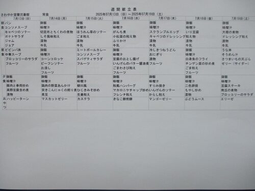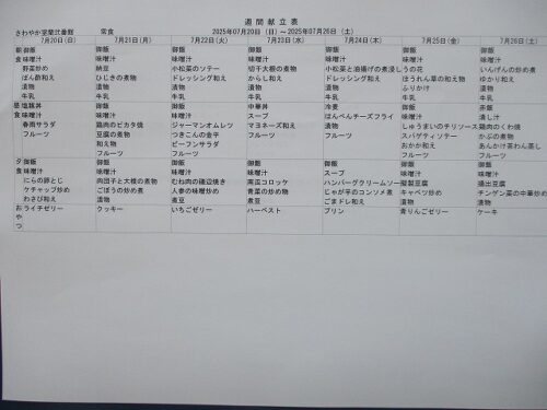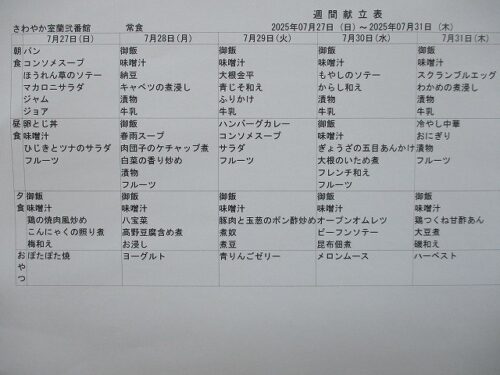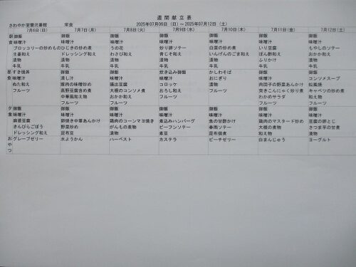 さわやか室蘭弐番館 7月 献立♪ 2025-07-01 2025-06-28 皆様こんにちは♪ 7月の献立をお届けします 行事食は26日(土)昼食です エレベーター内も掲示しております 食材の都合により急遽 変更させて頂く場合もございます ご了承下さい