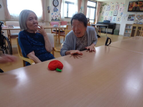 テーブルの周りを囲み小さなリンゴの人形のパスリレー🍎🍏