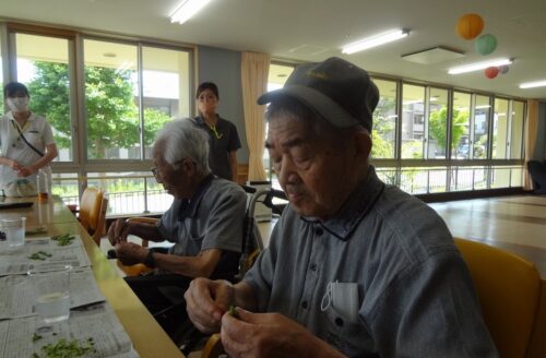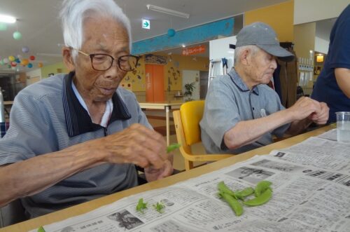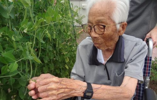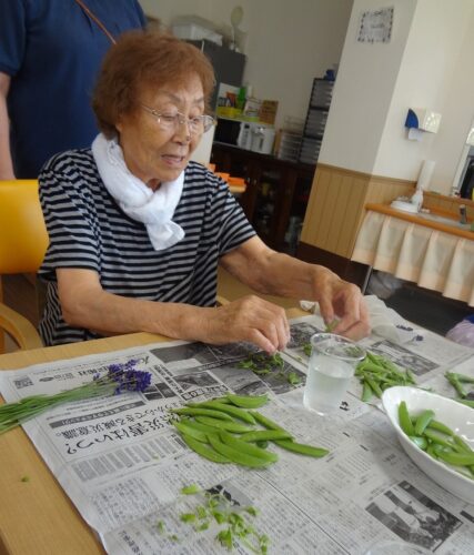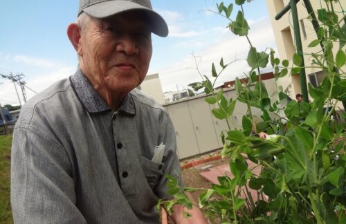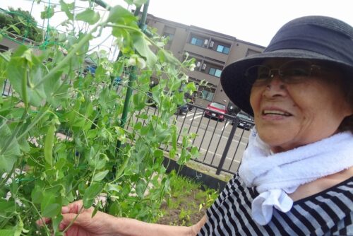 よく晴れた日に、4F入居者様とエンドウ豆の