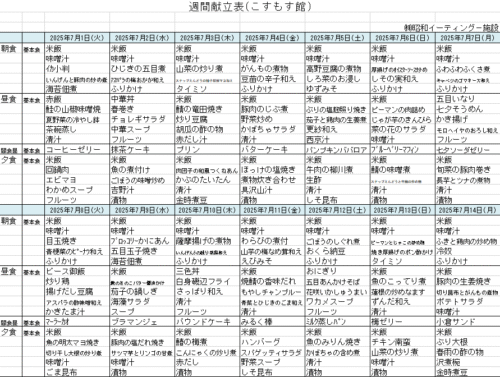 さわやかこすもす館 7月前半の献立ご紹介♪ 2025-06-30 2025-06-30 こんにちはさわやかこすもす館です(^^)/ 短い梅雨が終わりました(*´ω`) 猛暑に負けない為にもしっかり食べましょう(^^♪ 担当:能塚☺