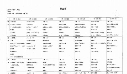 さわやかあかしの里 今週の献立♪ 2025-06-30 2025-06-30 今週(7/1~7/7)の献立です🥄 7月1日は、周年祭です。 昼食時に、流しそうめんでおもてなしを させていただきます。 お楽しみに♡