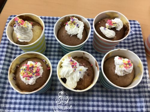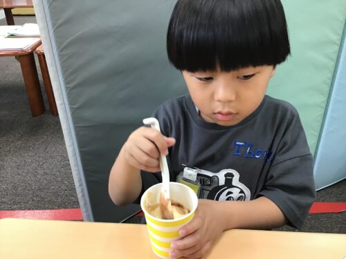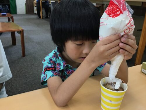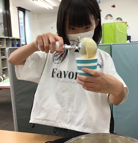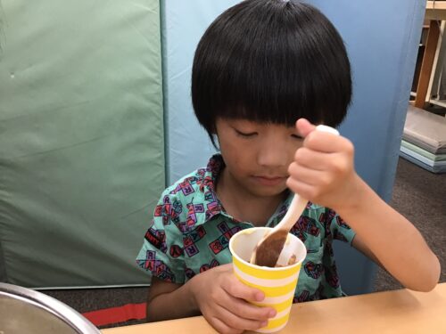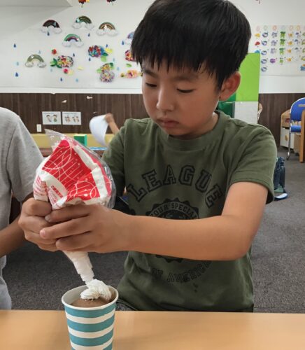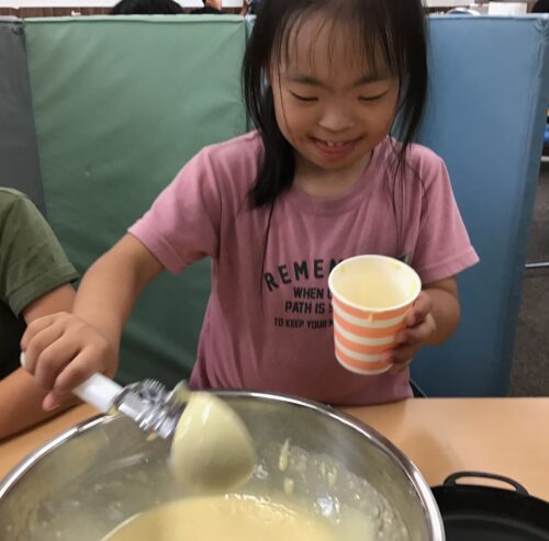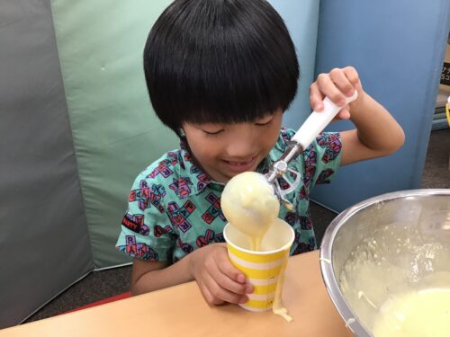柔らかい生地を流し込んだり、混ぜたり一つ一つ丁寧な作業が必要ですがみんな楽しんで取り組めています。次は何のレクレーションかなぁ。お楽しみに!