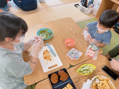 子ども包丁を使いながらウインナーやハンバーグなどの具材を切って準備してくれました👏