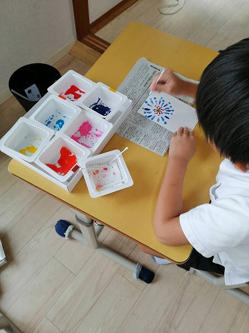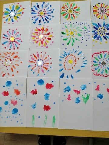 綿棒とウレタンスポンジのスタンプで、花火と金魚の2種類を表現します。