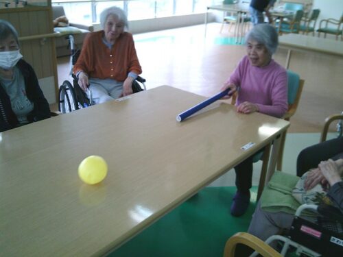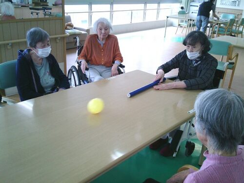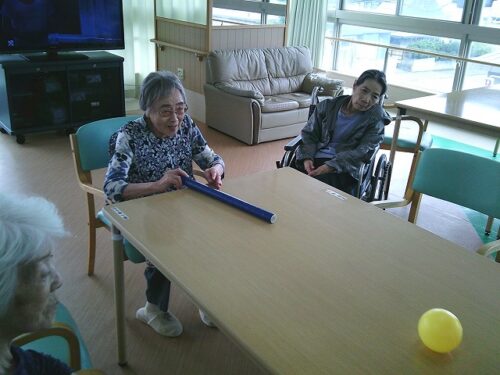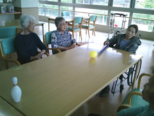 さわやか室蘭館 2F午後レク♪ 2025-07-06 2025-07-05 皆様こんにちは! 本日は、2Fの午後レクの様子をご紹介します♪ 棒を使ってボールを押し出し、ボーリングのピンを倒すゲームです🎳 狙いを定めます(`・ω・´) 「えいっ!」 とても集中されています! ゲームはやっぱりおもしろいですね(*^▽^*)