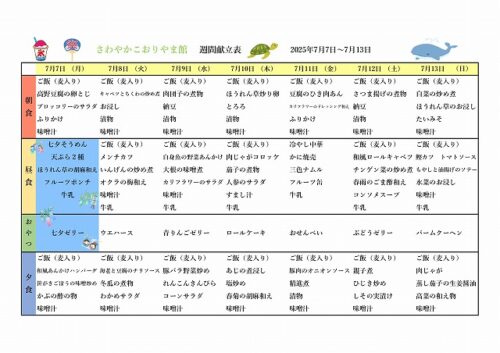 さわやかこおりやま館 今週の献立表🍚☆さわやかこおりやま館 2025-07-07 2025-07-05 こんにちは、さわやかこおりやま館です(^▽^)/ 今週の献立(7/7~7/13)こちらになります🍚 担当:千葉