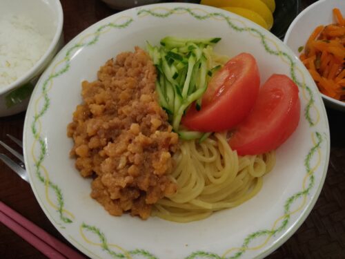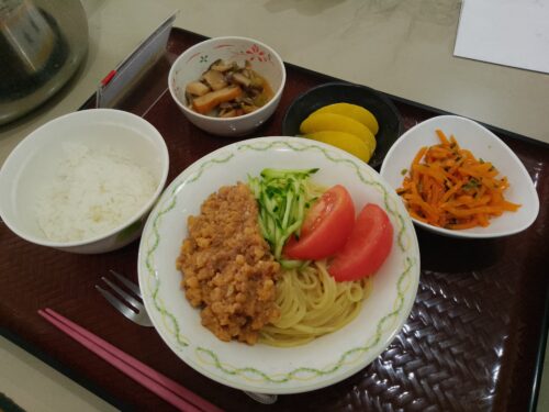 ジャージャー麺・キノコの和風煮・人参の甘酢和え・フルーツ